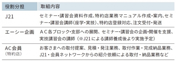 また、以下の役割分担のもと、AC各ブロック、支部単位でのセミナー・講習会を通じて、AC会員の資格取得、特約店化を支援していきます。