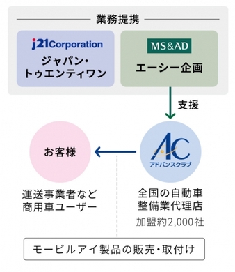 ジャパン・トゥエンティワン株式会社(本社:東京都渋谷区/代表取締役社長:加藤充、以下、J21)は、今般、三井住友海上グループのエーシー企画株式会社※1(本社:東京都千代田区/取締役社長:依田卓弥、以下、エーシー企画)と後付け衝突防止補助システム「モービルアイ」の取付・販売特約店支援に関する業務提携を結びました。J21は、本業務提携を通じて、三井住友海上火災保険株式会社が支援する自動車整備工場の組織であるアドバンスクラブ※2(会長:糀谷尚久、以下、AC)による「モービルアイ」の取付認定工場資格の取得、特約店化を支援していきます。