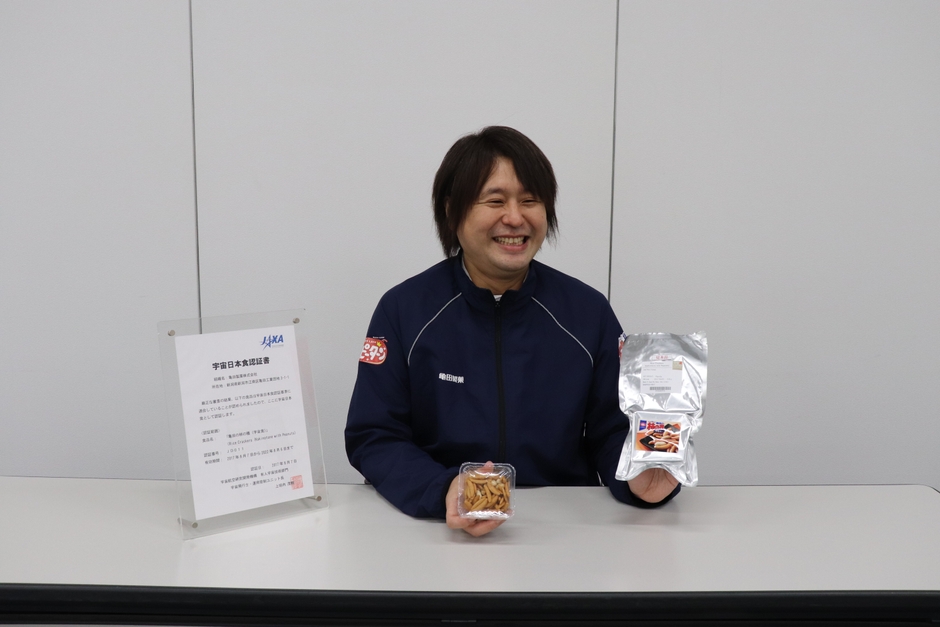 2014年「亀田の柿の種」を宇宙日本食にするための開発をスタート。2016年には「亀田の柿の種」の発売50周年を記念し節目の挑戦としてプロジェクトが立ち上がり、社内のエキスパート11人をプロジェクトメンバーとして招集。その後、構想開始から3年の研究・開発期間を経て、2017年8月7日に米菓で初めて宇宙日本食の認証を取得。宇宙日本食に認証された食品は、「亀田の柿の種(宇宙食)」を入れて現在45品目ありますが、米菓で認証されているのは「亀田の柿の種(宇宙食)」だけです。(宇宙日本食認証食品:全24社・団体、 全45品目)