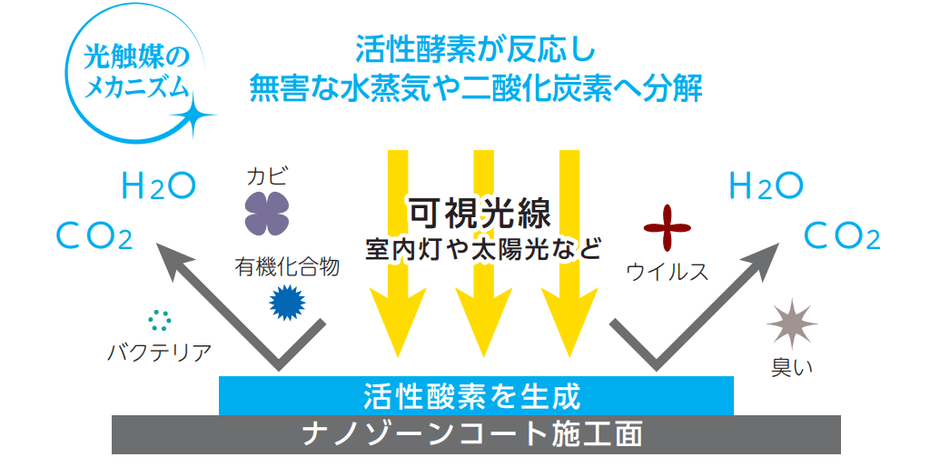 酸化チタンは紫外線を受けると酸化酵素を発生し、約99%の菌やウイルス・VOCなどを減少・分解します(未来環境促進協会調べ)。