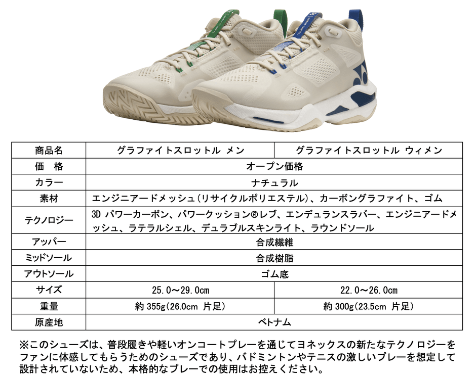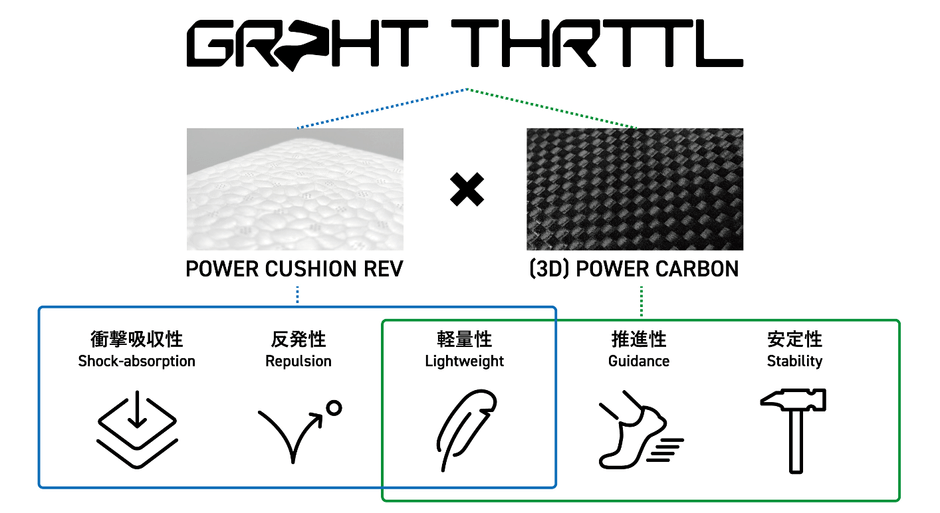 本製品は、ヨネックスの最新素材「POWER CUSHION® REV」と「3D POWER CARBON」を結合させた新構造「Grpht Thrttl」を最大限に体感できるコンセプトシューズです。
