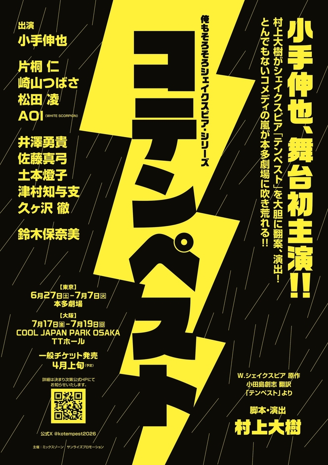 小手伸也、満を持しての初主演!「俺もそろそろシェイクスピア・シリーズ」始動。第一弾『コテンペスト』6月上演決定!