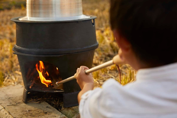 羽釜で炊飯するために、スタッフと一緒に火おこしを体験。羽釜の炉に藁や薪をくべ、火吹き棒を使い、火を育てます。火加減に注意しながら、お米を羽釜で炊き上げます。那須の米農家、「稲作本店(FARM1739)」より、美味しく炊き上げるポイントをお伝えします。