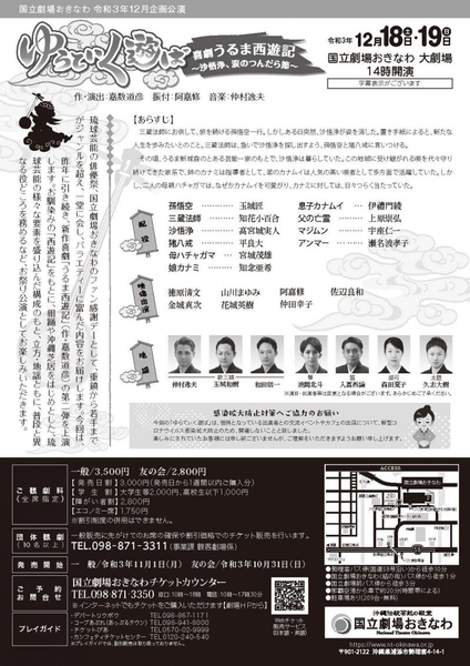 公益財団法人国立劇場おきなわ企画公演「ゆらてぃく遊ば 喜劇うるま西遊記~沙悟浄、涙のつんだら節~」が2021年12月18日(土) ~ 12月19日(日)に国立劇場おきなわ 大劇場(沖縄県浦添市)にて上演されます。チケットはカンフェティ(運営:ロングランプランニング株式会社、東京都新宿区、代表取締役:榑松 ⼤剛)にて発売中です。