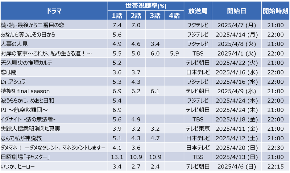 2025年春ドラマの初回~第4話までの世帯視聴率データをもとに、16番組の動向を分析しました。