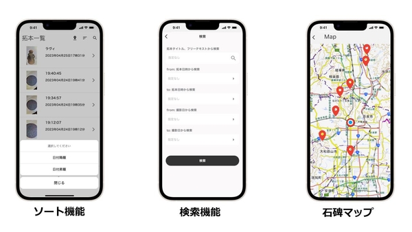 アプリで作成したひかり拓本の履歴がアプリ内でリスト化され、撮影日時、場所などの詳細を確認できます。また、ソート機能、検索機能に加え、スマートフォンのGPS機能を利用し、石碑マップの表示機能を実現。これにより、ひかり拓本の履歴を視覚的にもわかりやすく管理できます。