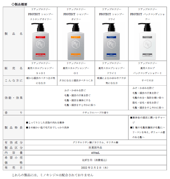 このたび新発売する「リアップエナジーPROTECT」は、従来品の処方を全面的に改良し、トリグリセリドを多く含む粘度の高い“こってり皮脂”をスッキリ洗い流す“激浄”を特長とした、将来の頭皮・髪が心配な男性向けの薬用スカルプケアシリーズです。