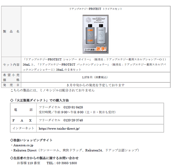 大正製薬株式会社[本社:東京都豊島区 社長:上原 茂](以下、当社)は、こってりとした皮脂を落とす男性向けスカルプケアシリーズ「リアップエナジーPROTECT シャンプー」「リアップエナジーPROTECT パックコンディショナー」(いずれも医薬部外品)を、2022年2月2日(水)より、当社通販サイト「大正製薬ダイレクト」などで新発売いたします。