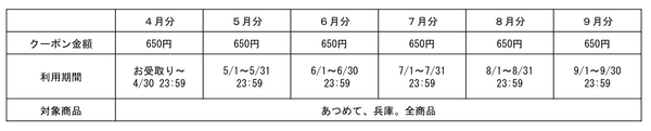 合計3,900円分のクーポンの利用期間は2023年4~9月で、各月650円分ずつご利用いただけます。ぜひこの機会に、当ショップでのお買い物をお楽しみください。