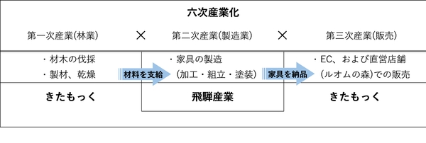 きたもっくが持つ豊富な森林資源とそこから調達可能な国産広葉樹、同社が保有する伐採・製材・乾燥技術と、飛騨産業が保有する「飛騨の家具®」の企画開発・デザイン・製造技術といった、両社の強みを掛け合わせることにより、県産材を活用した家具製作を通じて、地域の発展、持続可能な社会の実現に貢献します。