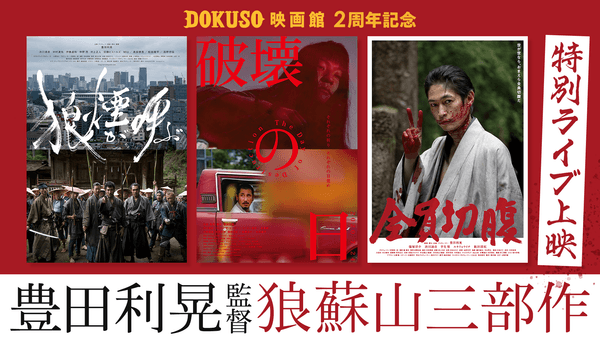 インディーズ映画に特化した見放題サービス「DOKUSO映画館(ドクソ―エイガカン)」を提供する、株式会社DOKUSO映画館(本社:東京都豊島区、代表取締役:⽟井雄⼤)は、サービス開始2周年を記念して、『狼煙が呼ぶ』、『破壊の日』、そして今回オンライン初配信となる『全員切腹』の豊田利晃監督による「狼蘇山三部作」を、オンラインライブ劇場「DOKUSOライブ」にて特別上映することを決定した。