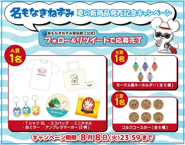 名もなきねずみ宣伝部【公式】Twitterアカウントより、当選者へのみ8月下旬にDMでご連絡いたしますので、応募された方はフォローを外さないようお願いいたします。