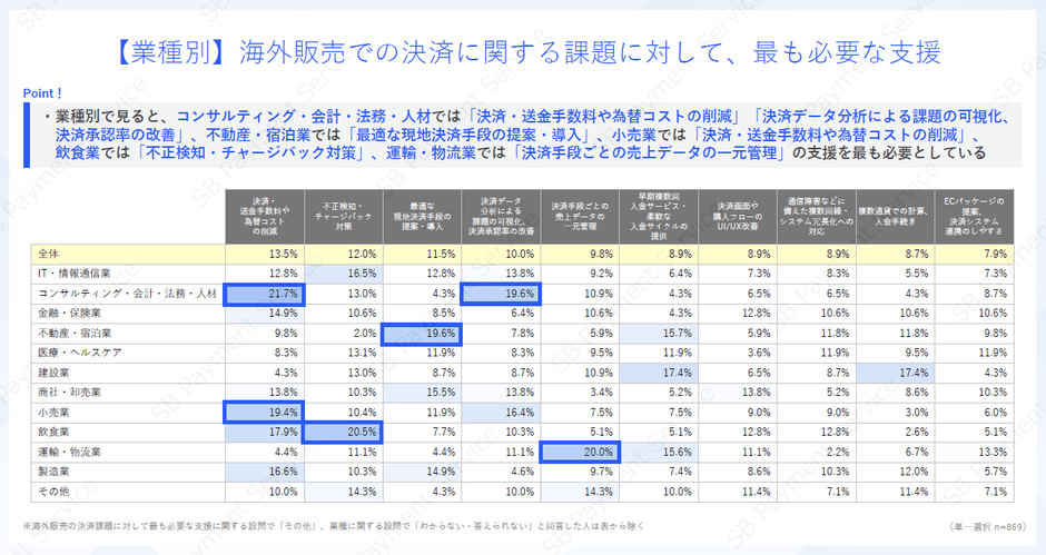 海外での販売における決済に関する課題に対して、最も必要な支援を尋ねたところ、全体で「決済・送金手数料や為替コストの削減」の支援を必要とする企業が13.5%で最も高く、「不正検知・チャージバック対策」(12.0%)、「最適な現地決済手段の提案・導入」(11.5%)が上位に挙げられました。業種別で見ると、コンサルティング・会計・法務・人材では「決済・送金手数料や為替コストの削減」(21.7%)と「決済データ分析による課題の可視化、決済承認率の改善」(19.6%)、不動産・宿泊業では「最適な現地決済手段の提案・導入」(19.6%)、小売業では「決済・送金手数料や為替コストの削減」(19.4%)、飲食業では「不正検知・チャージバック対策」(20.5%)、運輸・物流業では「決済手段ごとの売上データの一元管理」(20.0%)の支援が最も必要とされていることが分かりました。
