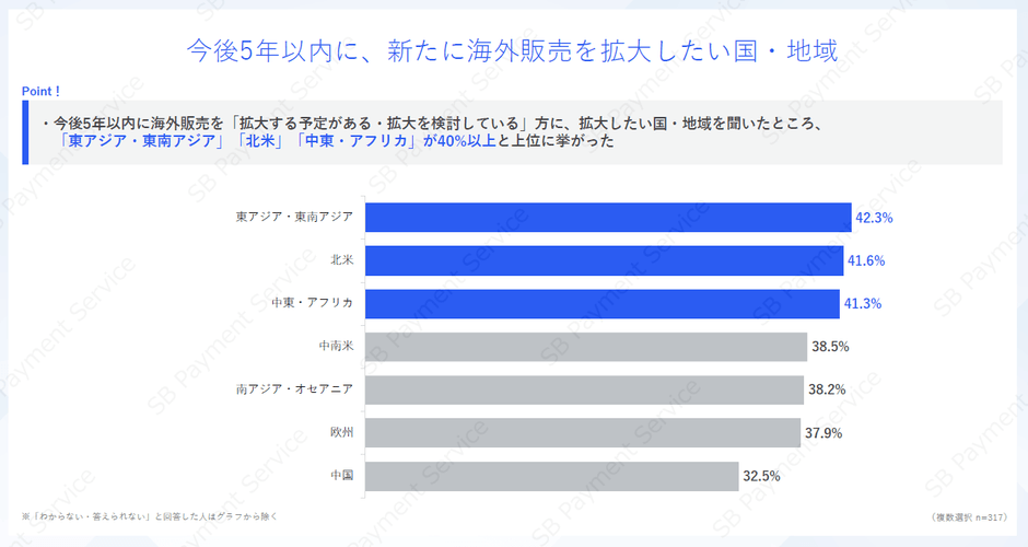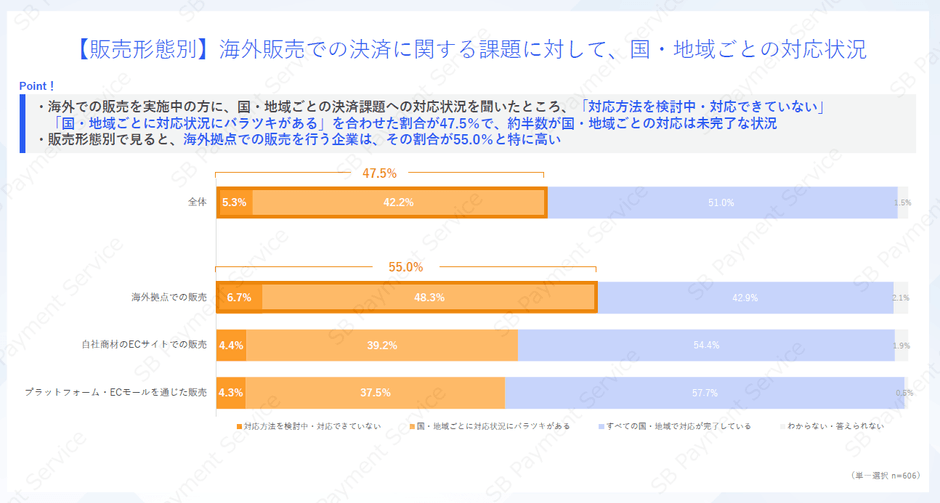 一方で、本調査では国・地域ごとの決済対応に課題を感じている企業も多く、海外販売の拡大にあたっては決済環境の整備が重要な要素となることが示唆されました。