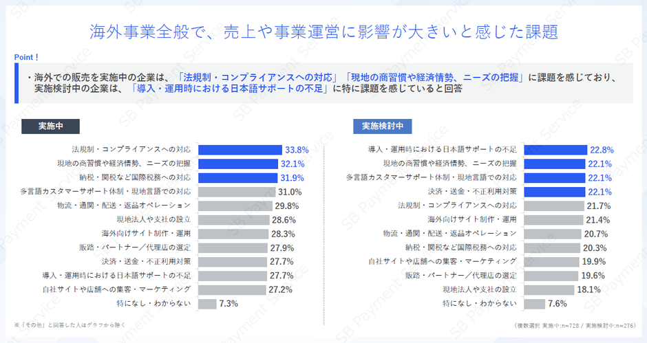 海外事業全般の課題は、販売実施中の企業では「法規制・コンプライアンスへの対応」(33.8%)、実施検討中の企業では「導入・運用時における日本語サポートの不足」(22.8%)がそれぞれ1位