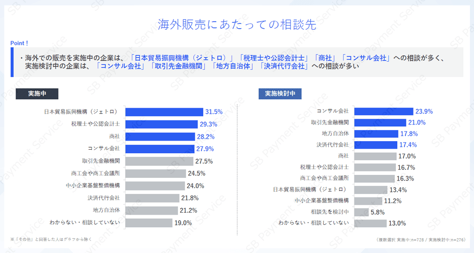 海外での販売を実施・検討する際に相談した先があるか尋ねたところ、海外での販売を実施中の企業では「日本貿易振興機構(ジェトロ)」(31.5%)、「税理士や公認会計士」(29.3%)、「商社」(28.2%)、「コンサル会社」(27.9%)が相談先として多く、海外での販売を実施検討中の企業では「コンサル会社」(23.9%)、「取引先金融機関」(21.0%)、「地方自治体」(17.8%)に続き、「決済代行会社」も17.4%と上位に挙げられました。