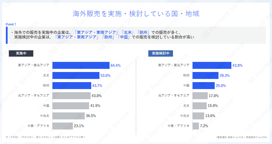 海外での販売を実施・検討している国・地域を尋ねたところ、海外での販売を実施中の企業では、「東アジア・東南アジア」(64.4%)、「北米」(53.0%)、「欧州」(43.7%)での販売を行っている割合が高く、実施検討中の企業では、「東アジア・東南アジア」(43.8%)、「欧州」(29.3%)、「中国」(25.0%)での販売を検討している割合が高いことが分かりました。