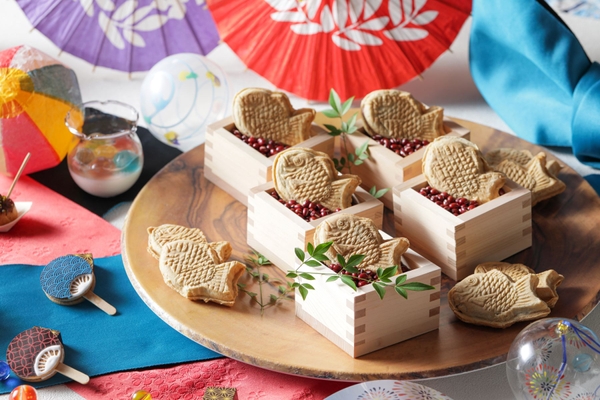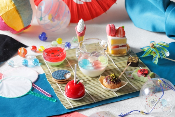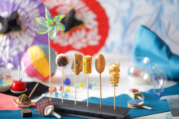 夏祭りには欠かせないりんご飴は“りんご飴ムース”、たこ焼きは“たこ焼き風シュークリーム”をはじめ“ヨーヨー杏仁豆腐”やうちわをかたどった“ミニうちわクッキーサンド”と手の込んだ遊び心あふれるスイーツが並びます。