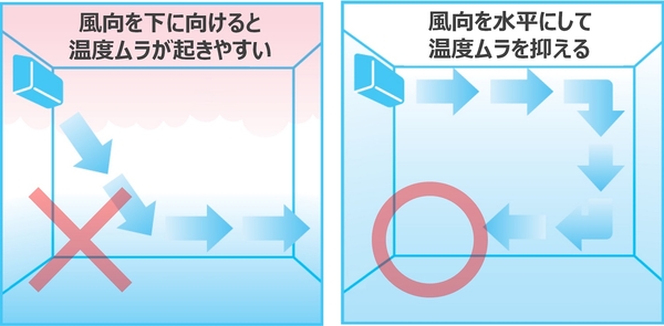 エアコン風向や扇風機を使った空気の撹拌で、温度ムラを抑える