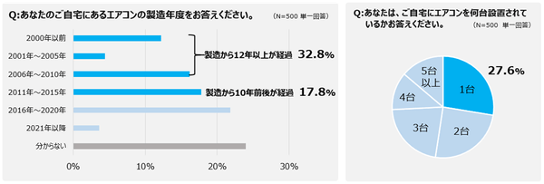 また、製造から10年前後(2011~2015年)が経ち、健康寿命をまもなく迎えるエアコンを所有する家庭は17.8%となりました。健康寿命とも言える「設計上の標準使用期間」を過ぎたり、まもなくその期間を迎えたりするエアコンを持つ家庭は過半数の50.6%にも達します。さらに、27.6%のご家庭ではエアコンの所有台数が1台ということも分かりました。