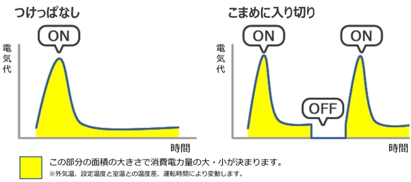 なお、定期的な窓開け換気をする場合でも、つけっぱなしをお勧めします。当社が行った実験では、30分に5分の窓開け換気のたびにエアコンの電源を小まめにオンオフにするよりも、エアコンをつけっぱなしにした方が、電気代が1日で約45.7円(1カ月換算で約1,371円)低くなる結果となりました。
