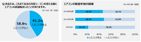 試運転を実施したことがあるご家庭は半分以下の41.2% 健康寿命を超えるエアコンを使用しているご家庭でも、実施率は46.3%