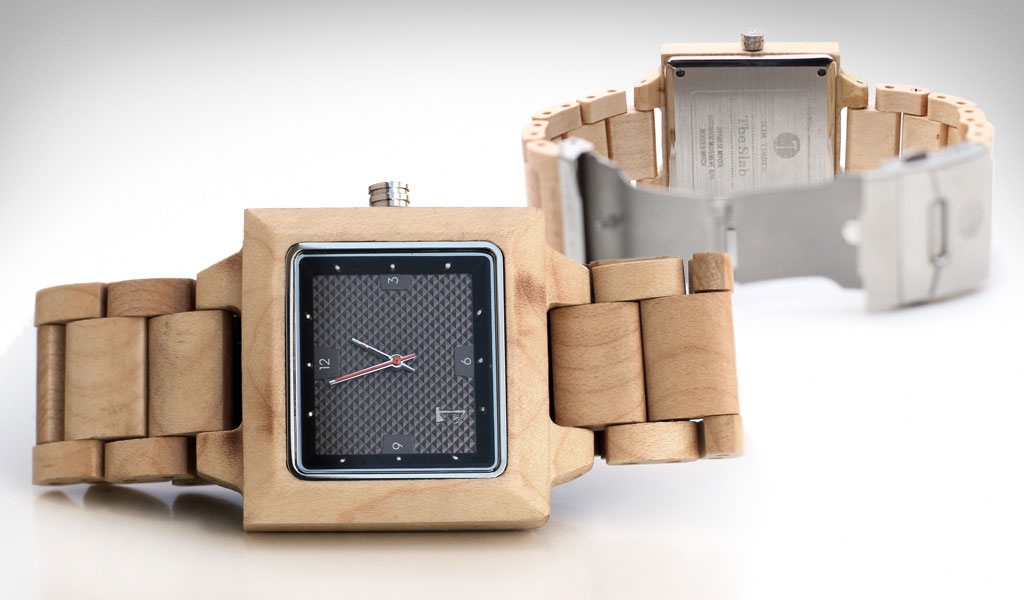 ・樹脂を含ませる加工をした木材を使用し、変形がなく耐久性を高めた木製腕時計「ザ・スラブ」。