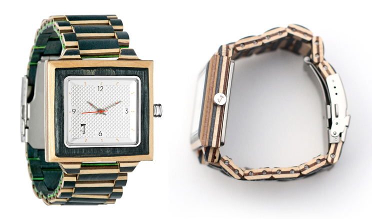 ・耐久性のあるスケートボード板を再利用素材として採用した木製腕時計「スケートウォッチ」。