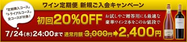 期間中の新規ご入会で、通常1カ月3,000円のところ、初回月限定2,400円でワイン2本をお届けいたします。