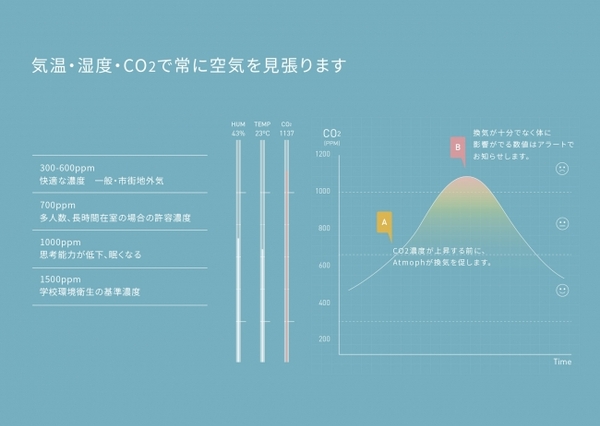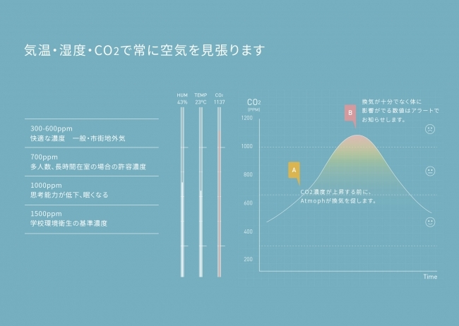 さらに、Atmoph Window Upは今までになかった新しい機能を追加しました。製品本体にCO2センサーを搭載し部屋の温度や湿度に加え、二酸化炭素の濃度をモニタリングします。快適な空間づくりには、新鮮な空気が必要不可欠。つい忘れがちな換気ですが、窓が部屋の温度やCO2濃度に合わせて換気を促すので安心です。視覚によるリラックス効果だけではなく、室内環境をより一層向上させることができます。