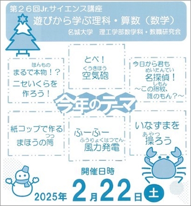 名城大学理工学部数学科は2月22日、天白キャンパスで小学3年生~中学生を対象にした「第26回Jr.サイエンス講座 遊びから学ぶ理科・算数(数学)」を開催します。