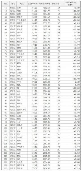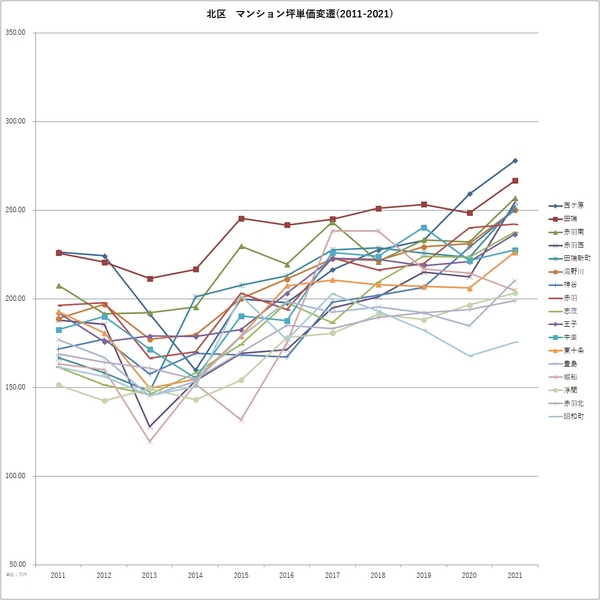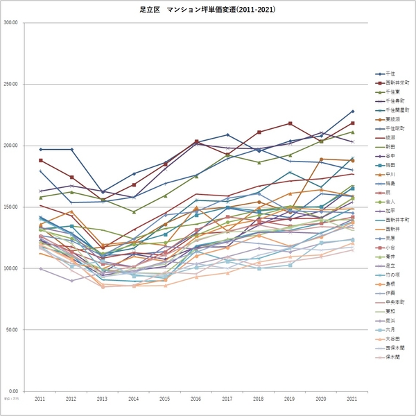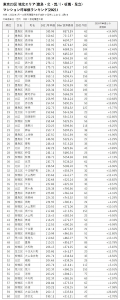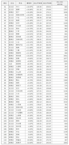 2011年と2021年のマンション坪単価より騰落率を算出。