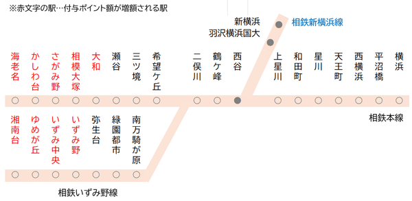 より多くのお客さまに相鉄新横浜線の利便性を実感いただけるよう、今回のキャンペーンでは相鉄線における定期券の発駅または着駅が相鉄本線「大和駅~海老名駅」または相鉄いずみ野線「いずみ野駅~湘南台駅」のいずれかに属している場合、これまでより付与ポイントを倍増して最大10,000ポイントをプレゼントします。