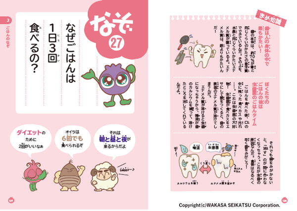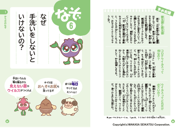 『ブルブルくんのからだ大百科』では、そんな子どもたちの疑問に答えるべく、わかさ生活のキャラクターブルブルくんが仲間たちとともに、身体や心に関する健康の「なぞ」を30個を授業方式で解決していく内容となっており、小さなお子様にも楽しんでいただける1冊となっています。
