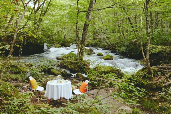 奥入瀬渓流では夏にかけてより湿潤な環境が保たれるため、当プログラムを実施する6月~8月は、1年の中でも生命力あふれる苔の姿が見られます。当プログラムで案内するのは、心ゆくまで苔を愛でながらアフタヌーンティーを楽しめる特等席です。包み込むような苔の景色を目の前にゆっくりと時間を過ごすことができます。