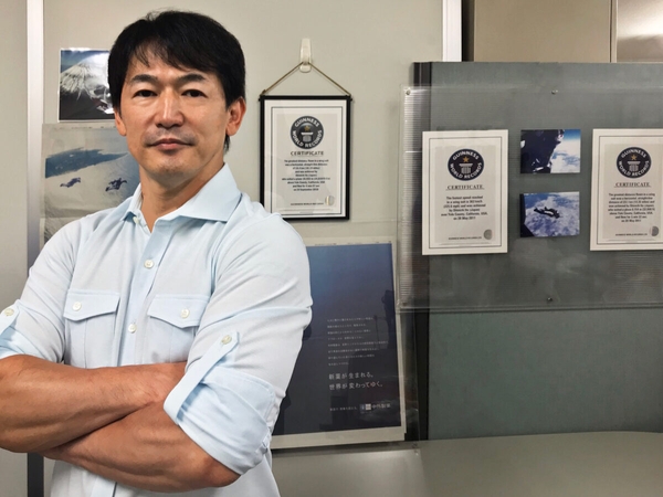 今回認定された記録は、2017年2月末にアメリカ・カルフォルニアで挑戦した高度2万5000フィート(7600メートル)からパラシュートを開傘し、水平直線距離46.2キロメートルで着地した「パラシュートでの最高直線距離飛行記録」。ジェット旅客機の飛行高度と同じ上空は空気が薄いため、離陸前に純酸素を1時間程吸って血液中から窒素を抜き、飛行中も酸素装置を装着する。上空は気温マイナス40度の過酷な環境のため、凍傷にならないように防寒にも備える必要がある。当日は天候や気流に恵まれ、時速約130キロのジェット気流に乗ることができたという伊藤さんだが、パラシュートを開く際、10Gほどの衝撃に耐えての記録達成だった。