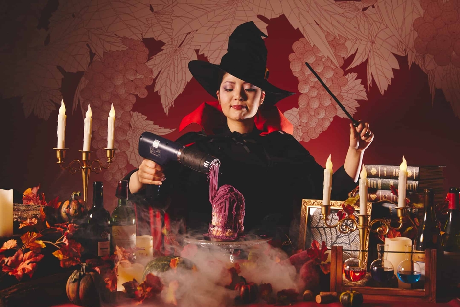 ビュッフェ&グリルレストラン「YYgrill(ワイワイグリル)」では、ビーツのスープやイカ墨のリゾットなど、ハロウィン期間限定のメニューを提供します。おすすめは、魔女パティシエが目の前で仕上げる赤紫色のモンブランです。モンブランのペーストには紫芋を使用し、ハロウィンらしく怪しげな見た目に仕立てました。見た目も楽しい、ハロウィンにちなんだ魔女特製のスイーツを味わえます。