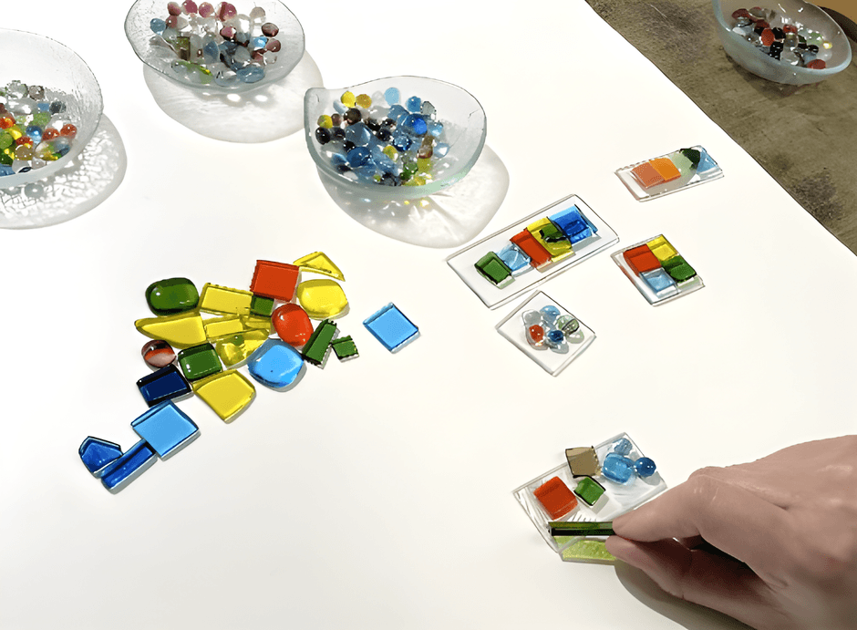 様々な色と形のガラスを接着させてオリジナルのガラス指輪やミラーを作ります。