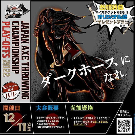 「"Japan Axe Throwing Championship Play-Offs 2022"〜ダークホースになれ。〜(以下、「当大会」)」とは、東京と大阪で12月11日に開催されるAXE THROWING(斧投げ)の大会となります。当大会に参加するためには、11月27日時点で累積サーキットポイント上位12名以内に入っていないことが条件となります。そして、当大会で上位2名に入ることで、「斧投げ日本一決定戦。"Japan Axe Throwing Championship 2022 @TOKYO"」への出場権を獲得することが可能となります。その他にも、参加者限定の特典として協会オリジナル斧とAXE THROWINGの利用料がセットになったお得なパッケージプランの購入ができます。