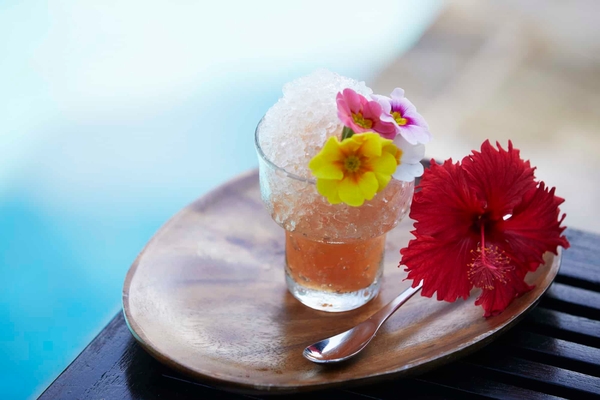 白砂のビーチに、カラフルなハイビスカスが一面に広がり、砂の白さと相まって、鮮やかさを際立てます。波の音に耳を傾けながら散策したり、写真を撮ったり、思い思いに楽しめます。また、グアバを使い、エディブルフラワーを添えた「お花かき氷」を景色と一緒に楽しみ、爽やかな風を感じながらビーチでお花見気分を満喫。さらに、ビーチに続く小道には、200輪のハイビスカスが咲き誇り、ワクワクする気持ちを掻き立てます。