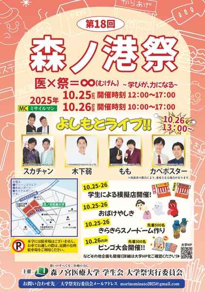 森ノ宮医療大学(大阪市住之江区、学長:青木 元邦)は、10月25日(土)、26(日)に「第18回森ノ港祭(大学祭)」を開催します!