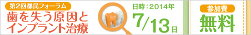 臨床歯科医グループとして初めて開催した「第1回都民フォーラム」(2013年7月7日)は盛況のうちに終了しました。第2回目となる本年は「歯を失う原因とインプラント治療~条件の違いによる適切な治療方法~」と題し、歯を失う主要な原因である「虫歯」「歯周病」「外傷(ケガ)」のそれぞれにおける適切な治療方法を、大学教授および開業歯科医師らが解説し、パネルディスカッションも行います。希望者には個別相談も受け付けます。