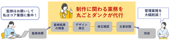 「ダンクの社労士監修サービス」は、こうした課題を解消するために、社労士の選定および監修ポイントの説明、監修結果の理解・精査からデザイン修正に必要な指示の作成まで、広告制作の専門家が的確に代行いたします。