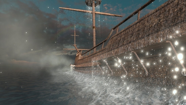 夕暮れの海面から、実在の帆船「ヴァーサ号」が静かに浮上。333年の時を超えても美しく残る姿から、使用木材の耐久性が圧倒的な存在感とともに伝わります。