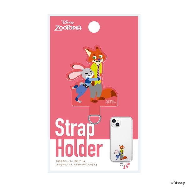 ストラップホールのないケースに挟むだけでストラップが付けられる、キャラクターデザインのダイカット ストラップホルダーです。端末とケースの間にストラップホルダーを挟み込むだけで、ストラップホールを付加します。