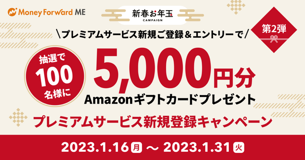 本キャンペーンは、新たな年を迎える大きな節目のタイミングで「2023年は家計管理や資産管理に挑戦してみたい」、「『マネーフォワード ME』をもっと活用していきたい」という方のスタートダッシュを応援する、年末年始のお年玉キャンペーンです。第1弾、第2弾と期間中2回開催し、それぞれ『マネーフォワード ME』へのご登録※1※2と口座連携の上エントリー、プレミアムサービスへのご登録とエントリーなど、条件クリアに応じて、抽選でAmazonギフトカード※3が当たります。