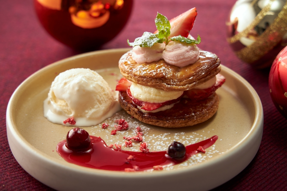 期間限定で『苺のミルフィーユ』をご用意。パイのサクサク食感と酸味のあるソースとマスカルポーネのクリームでパスタを召し上がったあとでもさっぱり食べらる。見た目でもクリスマスを楽しめる一品。