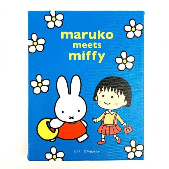 鮮やかなブルーに、仲良さげなまるちゃんとミッフィーのキュートなデザイン。周りを囲むお花もかわいい、ウォールキャンバスです。