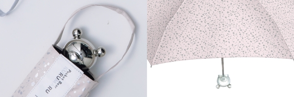 折りたたんで収納袋に収納すると、くまさんモチーフの持ち手がぴょこっと顔を出します。その姿は、まるでお布団にくるまったくまさんみたい。かばんに入れているときも誰かに見せたくなる、愛らしい折りたたみ日傘です。