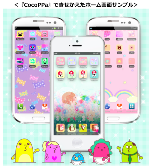 CocoPPaできせかえたホーム画面サンプル『CocoPPa』は、ユーザーが投稿したアイコンや壁紙を使ってスマートフォンのホーム画面を自由にカスタマイズできるアプリで、リリースから約22ヶ月経った2014年5月に2,500万DLを突破し、ダウンロードのうち32%を占める米国を筆頭に海外比率が84%という、グローバルなきせかえコミュニティとなっています。